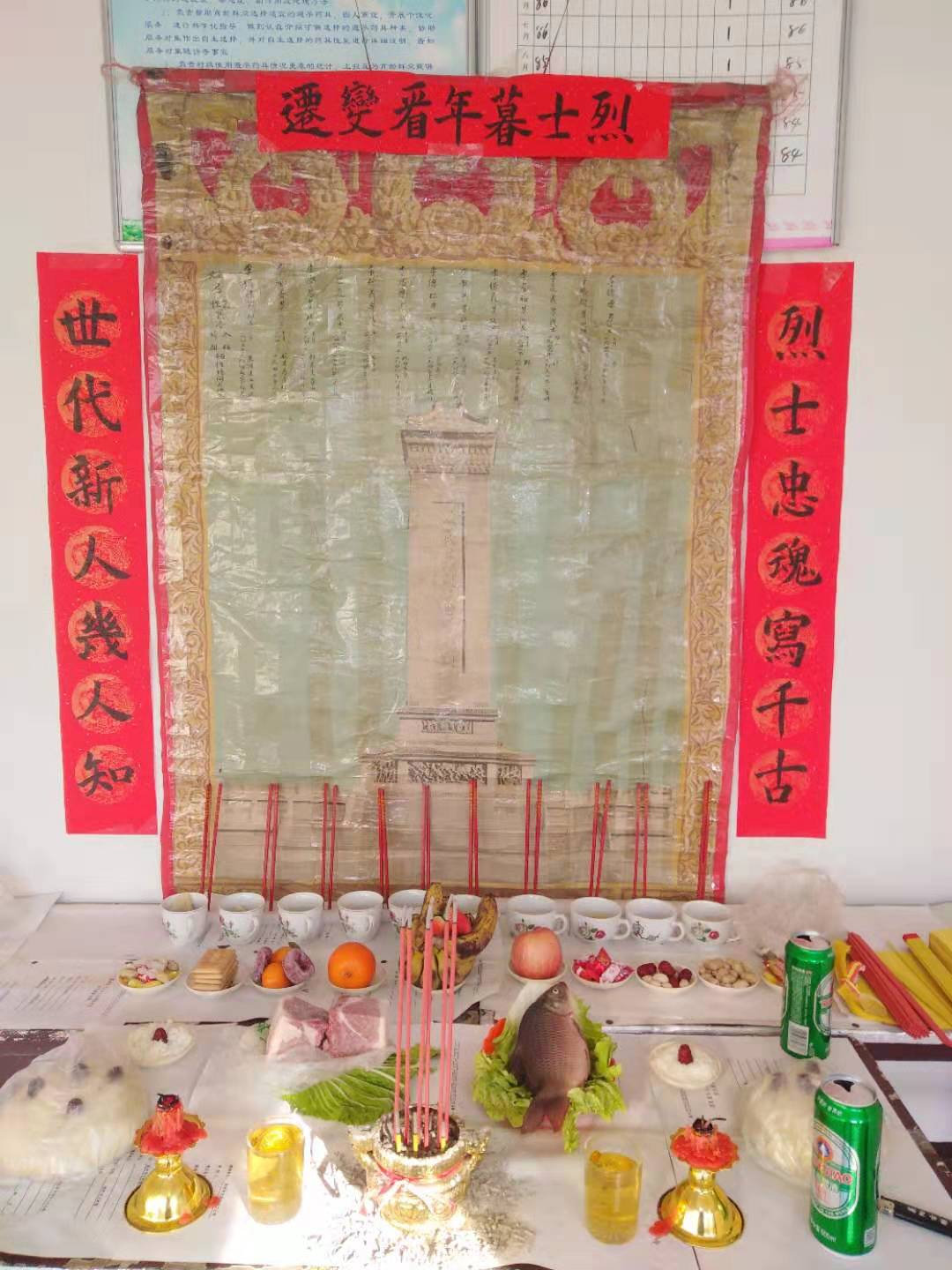 在烈士谱上,用大红色纸写了一副对联:“烈士忠魂写千古,时代新人几人知 。”横批:“烈士暮年看变迁”。