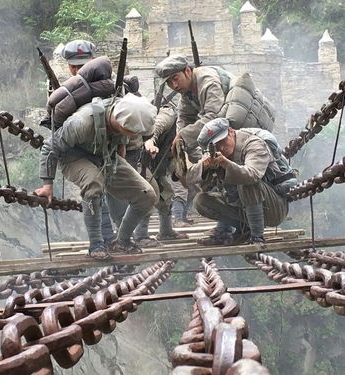 由此推断,在22名红军战士冒着枪林弹雨,“冲”到泸定桥桥板被拆掉抽去的部分桥板时,最佳的选择应该是:先骑坐在两根铁索上,然后身体趴下,两只胳膊夹紧那两根铁索,两条腿再夹紧那两根铁索,匍匐前进,才能够比较稳当地爬过去。