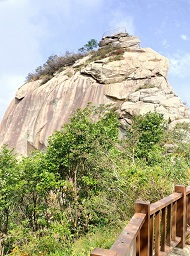 为便于游客攀登峰顶,景区沿着山势修建了木栈道和台阶,并设置了栏杆以保护游客安全。我和夫人奋力向山顶攀登,不时停下来在摩崖石刻“天下第一鸡”“报晓峰”“第二笑啼岩”等题字旁拍照留念。一路上,我们经常得到学员和他们的夫人关心、照顾和帮助。当我们登上“鸡冠”山顶,站在写着“鸡公山主峰 报晓峰 768.00米”的标志石碑旁合影留念时,心中充满了欢悦和自豪之情。