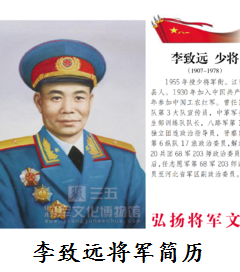 李致远小传:1907年8月出生,于都县桥头乡朱屋村人。1930年加入中国共产党,同年参加红军。历任战士、干事、连指导员、团总支书记、训练队队长、营教导员、团政委、军组织部长、旅政委、师政委、军副政委、河北省军区副政委,1955年被授予少将军衔。先后荣获二级八一勋章、二级独立自由勋章、一级解放勋章和朝鲜一级国旗勋章、一级自由独立勋章。