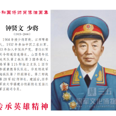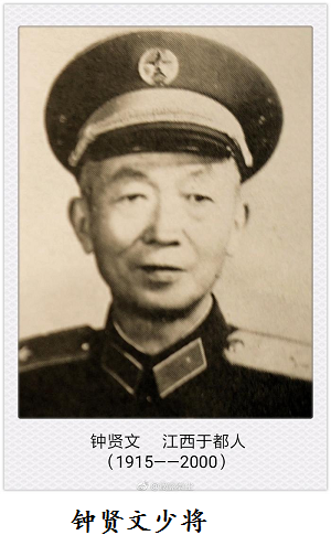 钟贤文小传:1915出生,于都县仙下乡富坑村人。1932年加入中国共产主义青年团,同年参加红军。1933年由团转入中国共产党。历任副班长、排长、区队长、队长、营长、团长,军分区司令部参谋主任、渤海军区军政学校校长、师长、南京步兵学校校长、省军区副司令员等职。1964年晋升少将,获二级八一勋章、二级独立自由勋章、二级解放勋章和一级红星功勋荣誉章。