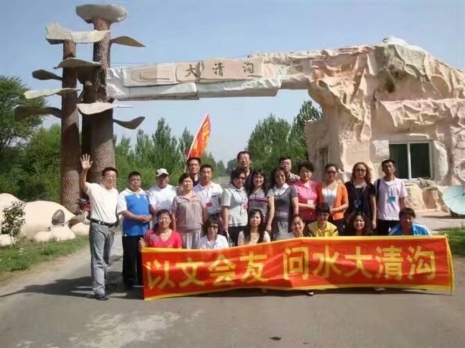 由于在QQ空间里写文章,便结识了很多有着共同情趣的文学爱好者。有一位文友提议“你把这些人聚集到一起,我们建立一个QQ群吧。”于是,我的《以文会友》QQ群就这样诞生了。这个群里的人,几乎都是文学爱好者,我们每天在群里吟诗作赋,成语接龙,非常的开心。你出上联,大家对下联,还有写横批的,有的时候,为了一个对仗句,大家会争议的面红耳赤。也会为了一首格律诗研讨的口干舌燥。为了提高大家的写作水平,我们还请资深的文学爱好者给大家讲课,有待于共同提高、共同进步。春天来了,我组织大家出去春游采风,布置作业是回来后每人一篇游记、散文、诗歌、随笔,任选其一。出游前,我给复印社打了一个电话,定制条幅。我在电话里说条幅写《以文会友》春游大芦花,条幅做好了,复印社通知我去取,粗心大意的我取回来条幅连看都没有看,我们就出发了。等到在大芦花的山顶上拍照的时候,条幅一打开,我们所有的人都笑喷了,条幅上面的《以文会友》春游大芦花变成了《以文会友》吹牛大芦花,东篱采菊人姐姐笑的都喘不过来气来了,嗨,既然已经错了,那么,我们干脆就给它来个一错到底,随之,便有了《以文会友》忽悠老爷岭、《以文会友》问水大青沟、《以文会友》寻宝双峰山等等,那些美好的瞬间,都已经永远的定格在我们回忆的史册,令人永生难忘!