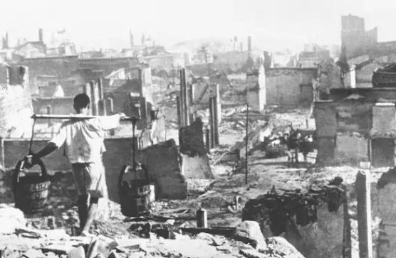 因轰炸中投下大量燃烧弹,重庆渝中区20余平方公里的弹丸之地上,一日间燃起16处大火,有的大火连烧3日无法扑灭。