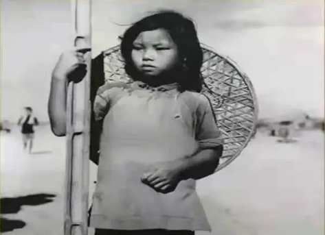 镜头在切换,穿流的人群、准备战斗的士兵,正在四川广汉机场用锤子砸碎石子的妇女,妇女的背上还背了一个孩子。一边挑着担子的一排光着上身的汉子,担子里装着石头。汗水浸满了他们的全身。