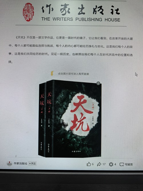 《天坑》(上 下)是驻站金牌作家路石(原名王桂宏)积七年之功,精心打磨而成的新作,2024年5月由作家出版社出版发行。这是一部文学作品,更是一面时代的镜子,它让我们看到,在改革开放的大潮中,每个人都可能面临选择与挑战,每个人的内心都可能经历挣扎与变化。这是我们每个人的故事,这是我们共同经历的时代。见证一段历史,也映照出我们每个人在时代洪流中的位置和选择。期待精彩佳作。推荐阅读。编辑:青梅煮酒
