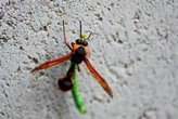 细腰蜂肯定见过,我不认识它,它也不认识我,当然我知道的法布尔肯定认识它,他在他那本《昆虫记》中无数次描述过各种蜂,当然细腰蜂就在其中,我想看书时我认真看过书中的插图,但最终,我的认识里,细腰蜂还是在我眼里书本上的:“昆虫纲,膜翅目,泥峰科。喜独栖。因其腹部前端呈杆状,故名细腰蜂。成虫用花蜜或发酵物作食料。幼虫以各种昆虫的幼虫体内物质为养料。成虫在产卵前先捕获其他昆虫的幼虫并刺昏置于巢内,然后产卵。孵化的幼虫即以该虫为食料。”