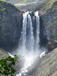 看罢小天池,我们又去观赏长白山瀑布。长白山天池北侧有一个出水口,流出一条清澈湍急的小河乘槎河,又称天河,它在流经约1200 米后从断壁飞流直下,这便是长白山瀑布,被誉为长白山第一胜景。瀑布落差 68 米,远远看去,宛如银河倒挂,从天而降。瀑布下端就是松花江的源头二道白河。