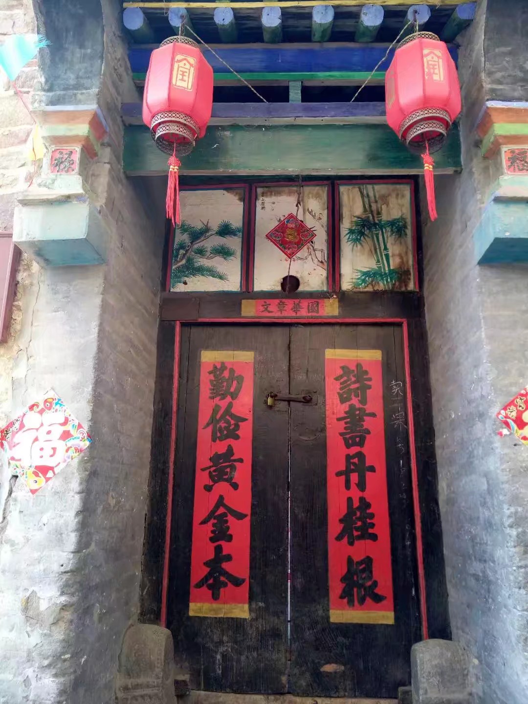 印象最深刻的是,许多人家门板上都书写着古朴的对联,黑色底漆的木门上面,红漆的底子,黄漆的上下边缘,黑漆的大字,三色相配,拙重而充满古韵;对联字体古拙苍劲,历经岁月沧桑,墨痕入木三分。诸如 “西宅翰墨,东园图书”“文章江海,书籍林泉”等内容表现了王硇人诗书传家的文化传统,蕴含着人们以诗书为乐事,不求闻达,只为提升修养的恬淡的人生追求;而“日暖三槐绿,风清五桂香”读之使人如同看见一幅清新美丽的画卷,闻到桂花的清香,感觉生活如此美好;“勤俭黄金本,诗书丹桂根”教人持家节俭而又不忘以诗书自励,既接地气又文雅脱俗,而且色彩感极强,声情并茂,读之令人满口生香。这些对联既有对自身修养的期许,更寄寓了当地百姓对美好生活的赞美、热爱与追求。