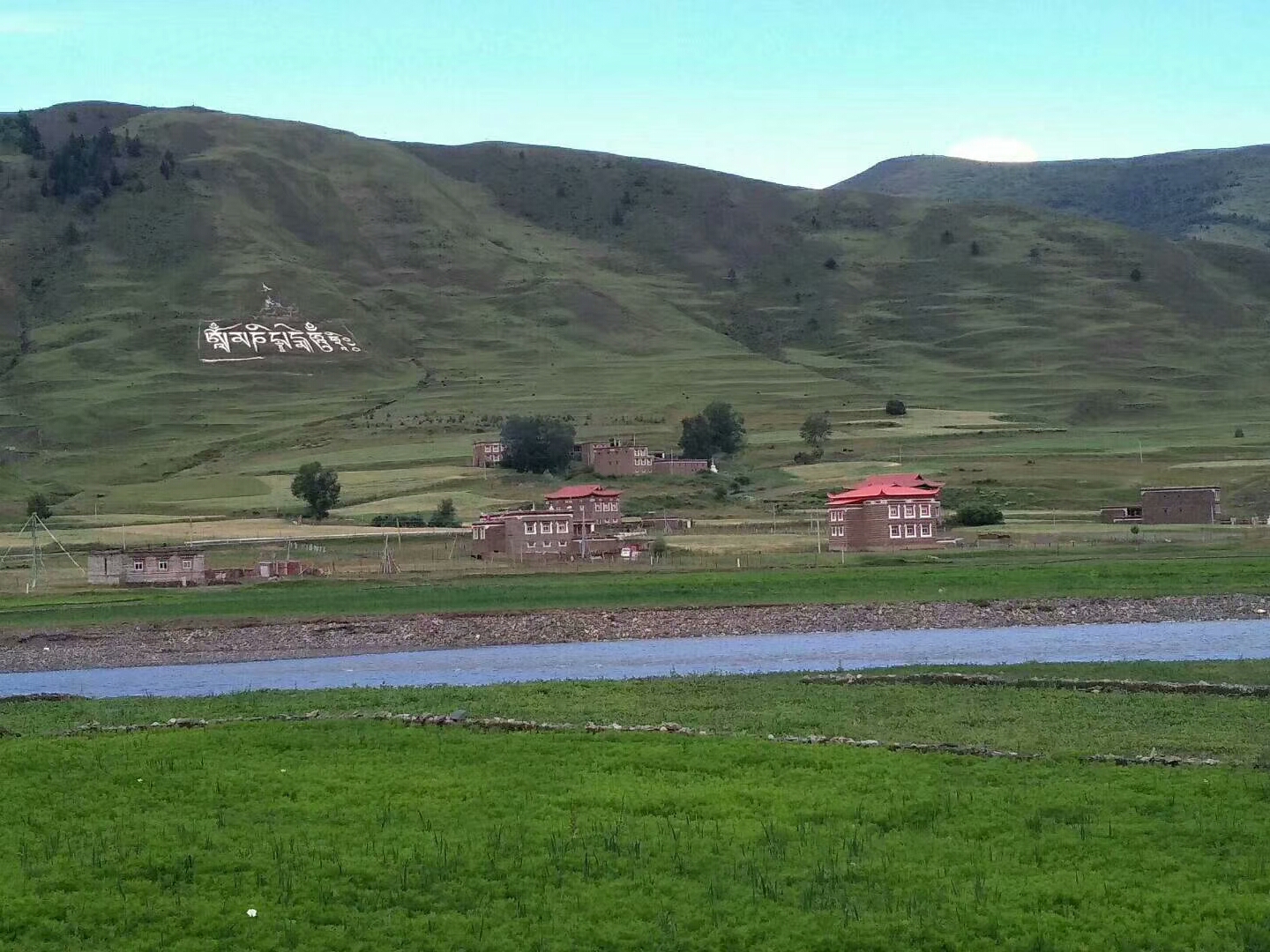 道路很好,车速很快,渐渐便有藏式民居,多是精致的客栈,簇拥着各色各形的鲜花。才发现这个十里长廊,是沿着河谷分布开的。公路恰好与河谷蜿蜒并行,颇有点相依相伴之感。又或者说,是沿着河谷修好的公路。悖论的典型啊,刚性与柔美的搭配,端直与盘曲的互补,简直是天衣无缝的衔接。映着余晖的水流,星星点点的房舍,画作般明快、清新。远处的山脊起伏褶皱,在地平线勾勒出成优美的弧线。大片的草坪,小块的花田。格子布一般铺在天地之间。草坪的绿色,又呈不同颜色梯度,增加了这块布的层次感。真的很美。但与想象里的那种震撼,或者说,与摄影作品上的呈现,依旧有很大的差距。