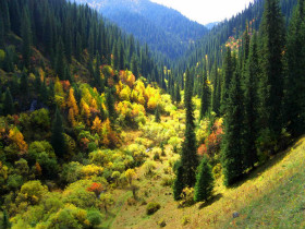 我们稍事休整了一下,继续向巩乃斯林场前进。巩乃斯森林公园在巩乃斯河的上游,位于巴音郭楞州的和静县巴音布鲁克公路干线之侧,距巴音布鲁克大草原95公里,距和静县240余公里。这里的海拨在1600米到2400米之间,群山连绵,沟壑纵横,奇峰突兀,花草弥谷;林海无边,松涛如海,雪山倒映在湖泊中,漫山遍野都是松树和野花;山岗上是一群群的白羊,它是一座巨大的动植物宝库,是天山森林资源最为丰富之处;雪鸡、猎隼、马鹿、棕熊等动物生活于其中,还出产雪莲、贝母等名贵药材,因此这里也是动植物资源最丰富的地方。