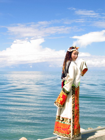 远处,青色的山峦反倒显得线条逶迤而绵软,像是风吹起的他的青色长衫。大朵大朵紧贴着山峦的白云,更像是爱慕着他的一群美少女,她们久久环绕着他,亲吻着他,围绕着他翩翩起舞。有那么一个时刻,天空中的一片白云忽的竖起,形似亭亭玉立的仙女,她微微低着头,含情脉脉地凝视着身下的青海湖,仿佛在向他倾诉从远古走来的绵绵情思?