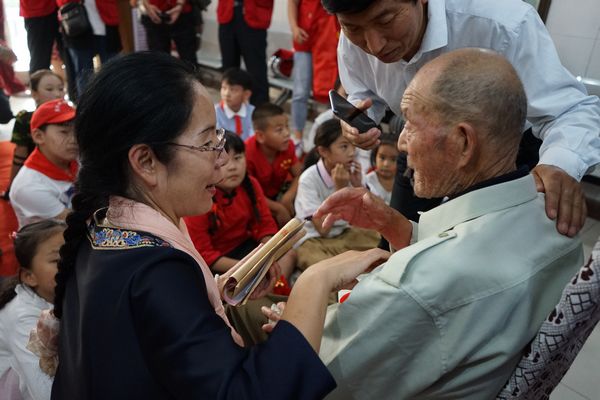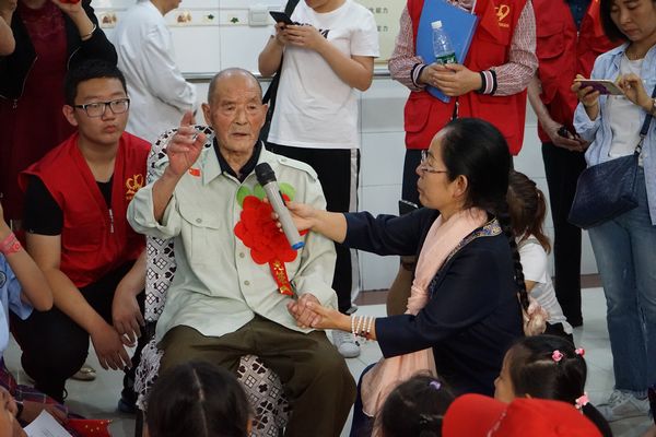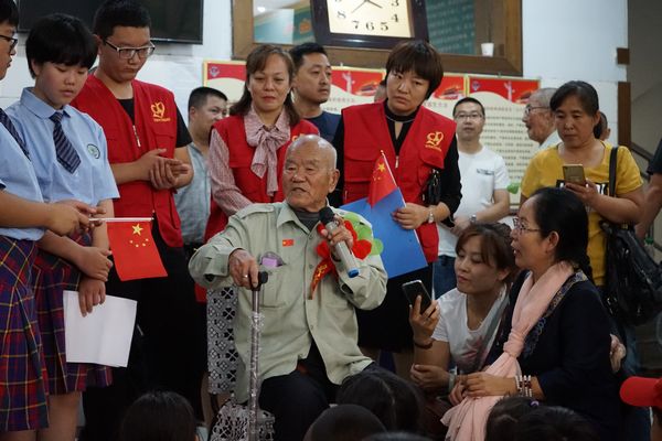 91岁的老兵向志愿者讲述自己参加解放战争的故事。