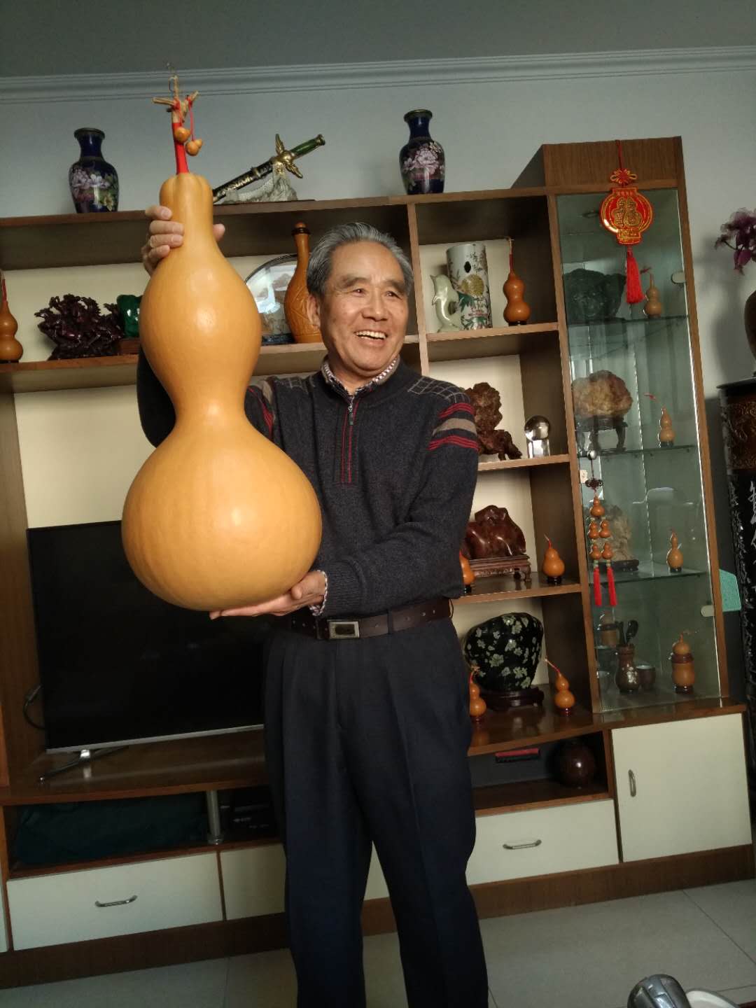 一是葫芦。从他的介绍中得知,葫芦谐音“福禄”。自然天成,包藏天地,寓意福禄寿喜。它嫩可食,老作器,形色皮质可赏玩,自古与人类有不解之情缘,是中华传统文化吉祥物之一。唐代李白有诗句“壶中自有日月天。”明代余善有诗句“一壶天地小于瓜。”(注:古代葫芦与壶通用。)香港著名国学大师饶宗颐九十多岁高龄,总结养生经验,说道:“我是坐在葫芦里。”