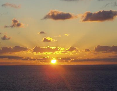 云头上开始涂抹了一阵红晕。我背向船艏看见航行的尾迹拖向太阳升起的地方,此刻东方水天线一片白云披上了霞光,一道道金光穿透白云四射,整个印度洋被染红了。
