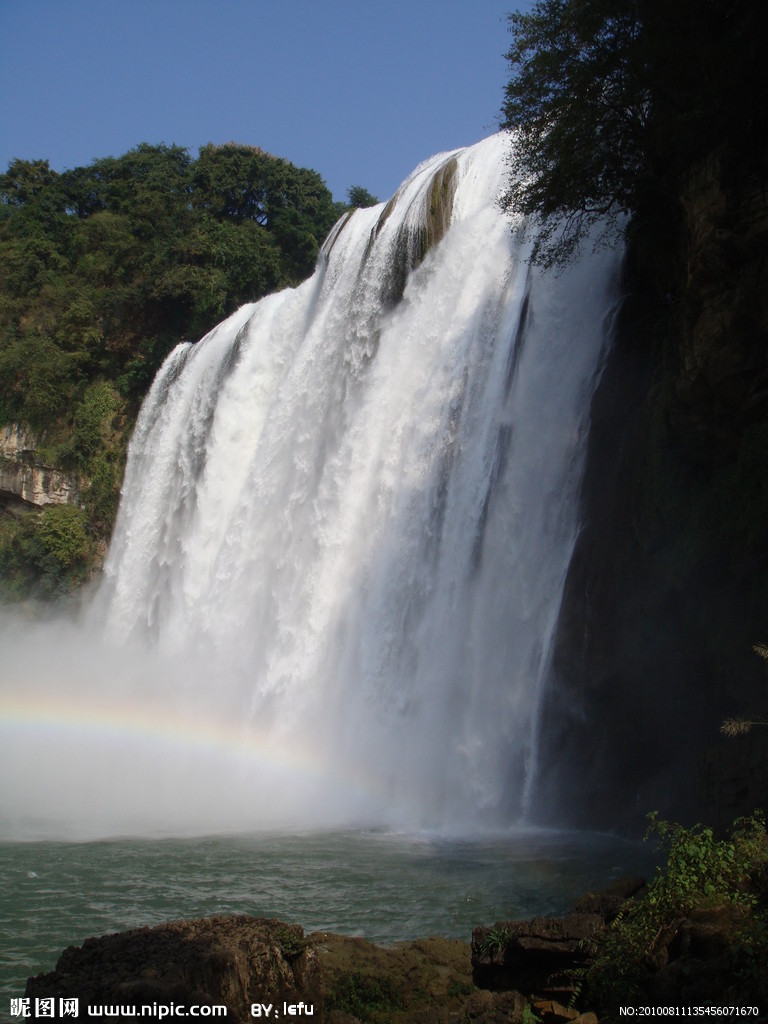 水是无色无味透明的液体,这是教科书上说的。可黄果树瀑布就另当别论了,它在流动中不停地变幻着色彩,飞流直下时它是白色的,流入潭中时它是蓝色的,更加奇妙的是,如果赶上晴天丽日,在阳光的折射下,它会衍生出一道绚丽的彩虹。蓝天白云相映,青山绿水相照,繁花彩虹相间,这岂不是人世间最美的图画?横看成岭侧成峰,远近高低各不同。看山是这样,观瀑也是一样,远观,近看,仰观,俯视,所得的视觉效果迥然不同。