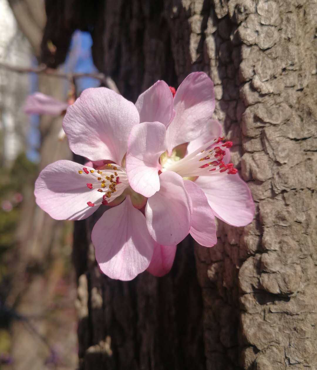 迎面桃樱相映红,霞光熏染绕花丛。