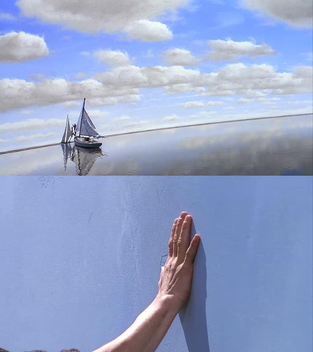 在不知真相前,楚门阳光灿烂,没有痛苦,自由自在,虽然他的字典里从来没有自由二字,摄影棚的生活就是他的一切。