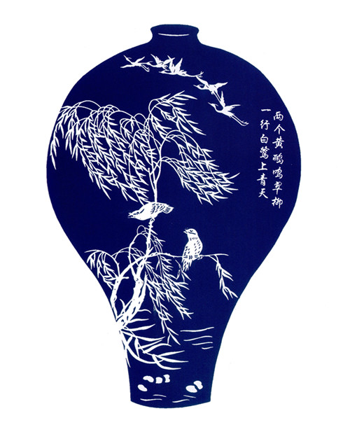 从此,张慕莉将自己的创作目光转向了对扬州文化的深度开掘。2006年,她从扬州博物馆的元代霁蓝釉白龙纹梅瓶的配色中受到启发:这不正像扬州剪纸的深底白宣吗?如果再将它美妙的器形移植到剪纸之中,那一定会像它一样,古得经典、美得惊艳吧?