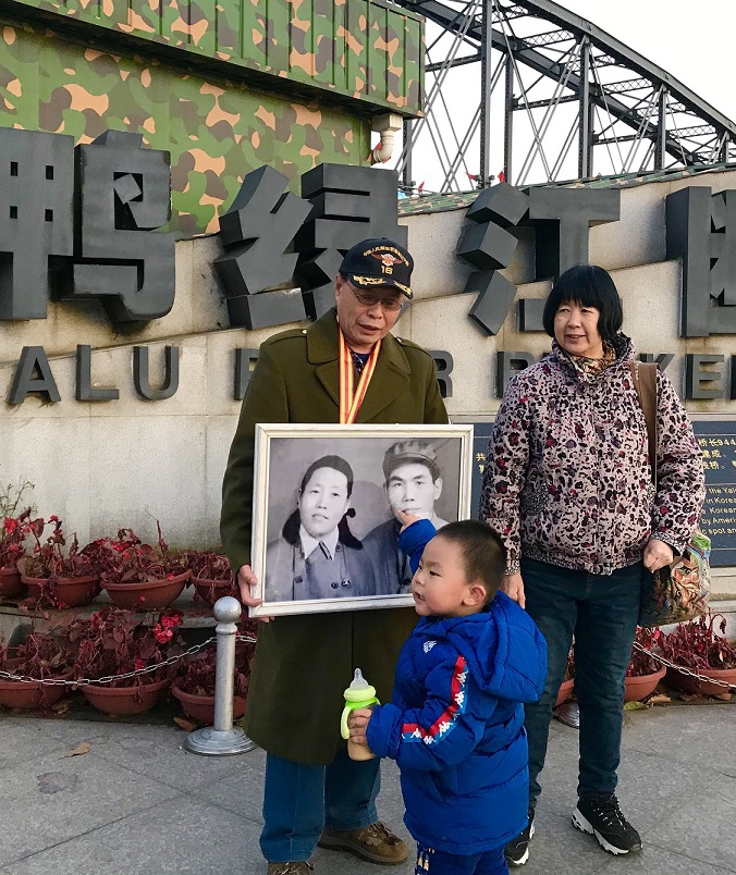 当一位身穿军大衣、头戴辽宁舰金黄橄榄枝印花,黑底作训帽,胸前配戴一枚国防服役金质奖章的老兵,双手紧紧捧着志愿军父母亲的遗像,漫步走在鸭绿江边时,一些路过此地的车辆骤间减缓了行驶速度,许多行人的目光刹那间也被这一幕吸引了,只见有人手指着我小声嘀咕,有人走过后还在回望……从这些人的表情上不难看出他们对“最可爱的人”的无上崇敬!人们怎能忘记70年前,成千上万的志愿军战士们,为了祖国的安宁和人民幸福,雄纠纠气昂昂垮过鸭绿江,在朝鲜战场上抛头颅洒热血,打败了以美国为首的“联合国军”,创造了世界军事史上以劣胜强的奇迹,用生命书写中国人民站起来后屹立在世界东方的宣言书。此时,我站在被敌机炸毁扭曲的钢铁桥梁面前,仿佛听到了志愿军指战员在松骨峰、上甘岭、金城战役阵地上英勇杀敌的枪炮声和胜利的欢呼声……