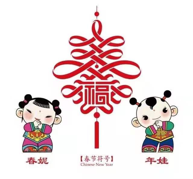 “年娃”“春妮”的设计创意,源自传统文化的“金童玉女”,是春节吉祥喜庆的象征,有招财、开运、纳福、平安等寓意。男左女右且略呈弧形的身形布局,切合了“左阳右阴”的和合传统,蕴含了阴阳太极的对立统一。其造型饱满、圆润,并沿用传统的发型头饰。肚兜上装饰的“蝙蝠”“双鱼”图案,意为“福庆(蝙蝠)有余(鱼)”,表达了人们对来年美好前景的向往。“虎头鞋”和“绣花鞋”也有“春天即至、避邪祈安”的寓意。两个可爱的“萌娃”都行拱手礼,既表达了人们辞旧迎新的美好祝愿,也体现了男女平等的时代新风。