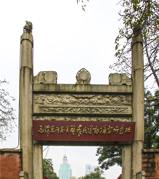 十二月的广州,依然温暖如春,天高气爽,阳光和煦。我们迎着朝阳去参观广州农讲所旧址。讲习所坐落在广州市中山四路42号。走下车来,我们远远就看到悬挂着 “毛泽东同志主办农民运动讲习所旧址”的匾额,这是1953年由周恩来同志为农讲所亲笔题写的匾额。馆址原是番禺学宫(孔庙),始建于1370年。