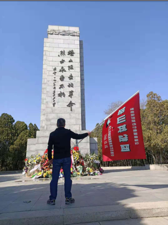 天亮了,吃过早饭,我们乘车穿过市来到了塔山堡村。在村里的“英雄树”、“白刃格斗场”、“胜利河”三座遗址碑和纪念碑前,我们展开红旗,阅读着碑文,窥探着70多年前那个枪炮大作的时空,仿佛看见了年轻的父亲们浴血拼杀的身影!我忽然有了这么几句,赶忙抄录下来:“当年鏖战急,塔山堡前烟遮蔽。拼死相搏几出进,洒血凝樊篱。”是啊,想想那面林建民倾情设计、八位女战士含泪绣出的“塔山英雄团”团旗,记录了我们多少塔山父辈的牺牲和不朽功勋!(下图:毛建凯不说话,一把接过旗帜,高高上举、向上举!)