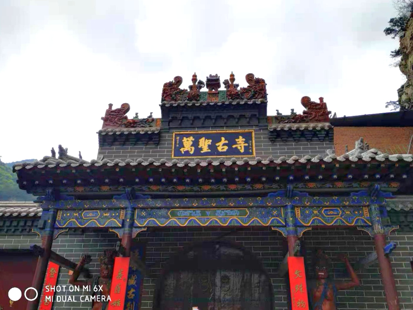 只见主、副两座庙门紧闭。原来该寺是每逢初一、初八和初十五才开门。新近重修的寺庙门面古朴典雅,原洪洞县人大主任汪学文书写的“万圣古寺”几个金色门字格外醒目,大门两侧的楹联也极富深意:“青山藏古刹善从心始,五峰浮禅影佛自峡出”;南侧边门的楹联则是“登上菩提道,进入解脱门”,可以看出此处乃佛家道场。大门的廊下左右侧分立着两位圆睁双目威猛高大的门神。门神前的两侧立柱上悬挂的楹联是“文殊初演佛出峡,菩提始创清凉寺”。据史料说,万圣寺中台景天阁碑文记载:“是寺,壬寅之春,其西南山七宝佛像百六十余尊”。故名佛山峡,也称出佛峡、七佛峡。该寺地理环境优美,建筑规模宏大。除佛山峡崖下的主体寺院外,在佛山峡西南的山崖上,还建有东、西、南、北、中五座台阁,故史上有“小五台”之称。据载,寺北佛出峡山顶建有金顶十三级舍利宝塔一座,塔下石崖有一个“三贤洞”,洞口建有佛殿,塑有佛像。由洞口进入百余米,即分为三个洞,传说能通往五台山、小西天和千佛寺。这三个洞道,到底是通向何处,至今仍是一个迷。
