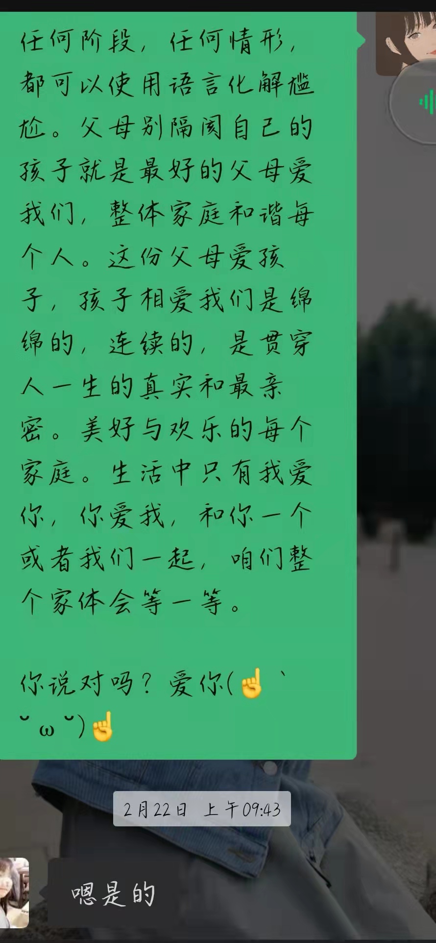 备注:任何阶段,任何情形,都可以使用语言化解尴尬。父母别隔阂自己的孩子就是最好的父母爱我们,整体家庭和谐每个人。这份父母爱孩子,孩子相爱我们是绵绵的,连续的,是贯穿人一生的真实和最亲密。美好与欢乐的每个家庭。生活中只有我爱你,你爱我,和你一个人或者我们一起,咱们整个家体会等一等。你说对吗?爱你。这是我们的交流,是在2022年2月22日。孩子回我:“嗯是的”。
