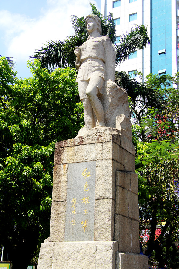 绕过“为了和平”雕像,是一位红军女战士的花岗岩雕像。雕像坐北向南,女战士长衣短裤,脚穿草鞋,打着绑腿,肩背竹笠和步枪,头戴缝着红五星的八角帽,眺望远方,一副风尘仆仆的样子。雕像底座正面,刻着胡耀邦的金色题词:“红色娘子军”五个大字。这尊红军女战士雕像,是琼海市中心那座雕像的复制品,底座特别低。