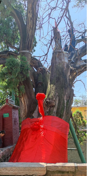 唐代诗圣杜甫曾赞美柏树“霜皮溜雨四十围,黛色参天二千尺”。眼前的这棵侧柏主干粗壮,周身还裹满了一层层的红布,其分枝犹如虬龙向四面八方的天空伸出有力的神爪,好似群龙盘踞,非常威武壮观。其中有一根断枝,看上去带有明显的黑色烧痕,据说那是不知何年被雷电击中留下的残迹。