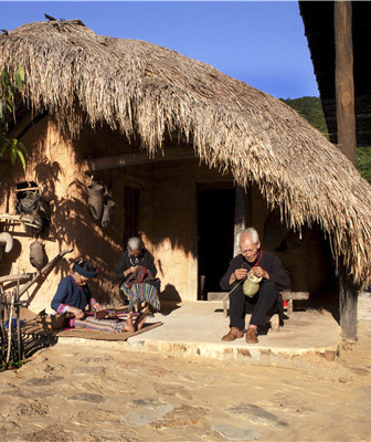 这些绣面文身黎族老人或坐在屋前,或坐在游人经过的长廊里,纺棉线、织锦绣,微笑而充满善意地看着游客,从不避讳游客的照相机。你要与老人合影,她会配合的很好,然后你就随便给老人一两元钱,她就会心地点点头表示谢意。如果你没有零钱给她,她也不会向你讨要,脸上仍然充满的善意。