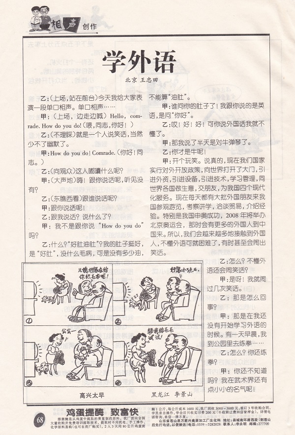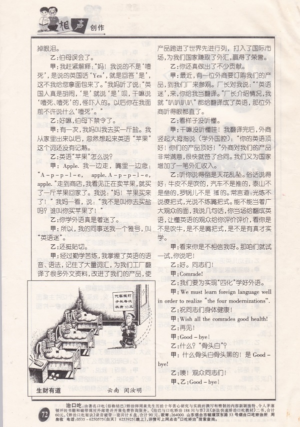 乙:听你说得倒是天花乱坠。俗话说得好:牛皮不是吹的,汽车不是推的,泰山不是垒的,罗锅不是揻的。常言道:光练不说傻把式,光说不练嘴把式。能不能当着广大观众的面,我说几句话,你当场给翻成英语,让懂英语的观众给你评价评价,看你是不是吹牛,是不是嘴把式,是不是有真才实学。