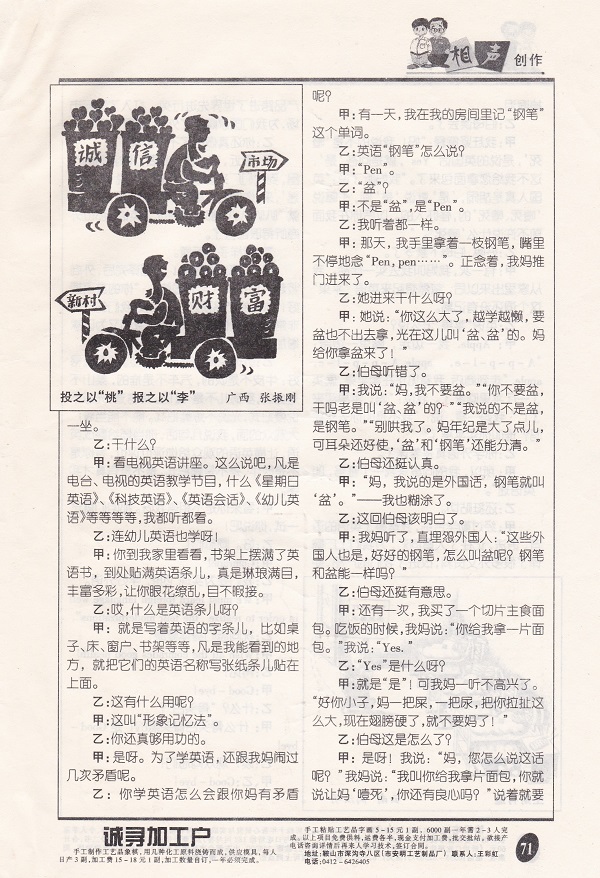 甲:“妈,我说的是外国话,钢笔就叫‘盆’。”——我也糊涂了。