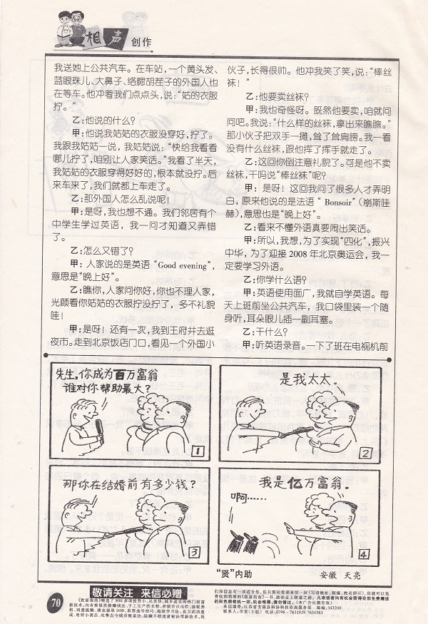 甲:干嘛没听懂呀!我翻完后,外商竖起大拇指说(学外国腔):“你的英语顶好!你们的产品顶好!”外商对我们的产品非常满意,很快就签了合同。我们又为国家增加了一笔外汇收入。