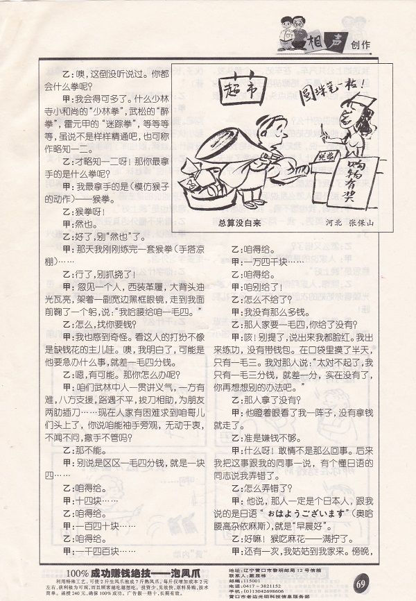 甲:忽见一个人,西装革履,大背头油光瓦亮,架着一副宽边黑框眼镜,走到我面前鞠了一个躬,说:“我哈腰给咱一毛四。”