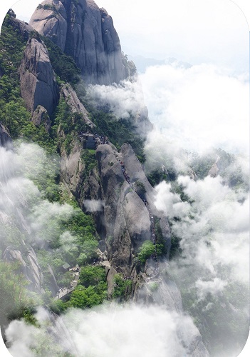 黄山错落有致的峰峦,形态各异的古松,千姿百态的怪石,梦幻莫测的云海,光彩耀目的日出,还有银装素裹的冬雪雾凇,构成了黄山静中有动,动中有静的巨幅画卷,赋予了黄山巨大的艺术魅力和神奇的风采。正如明代大旅行家徐霞客所说“薄海内外无如徽之黄山,登黄山天下无山,观止矣!”