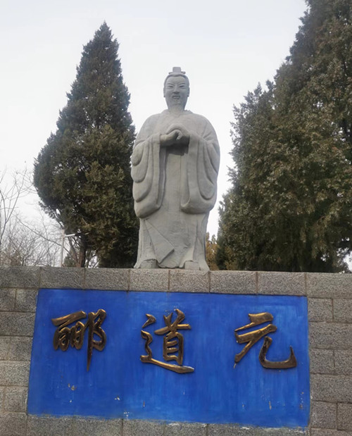 一千五百多年过去了,沧海变桑田,城郭成废墟,“郦道元故居”也不可能保持原址原貌。有这么个地方让人凭吊,已经是很幸运了。这是个两进小院,大门三间,二门一间,正房五间,都是一层建筑。前后院里种的是各种蔬菜,倒像个常见的农家小院。过大门,有个一米多高的台子,上面有郦道元的塑像。只见他拱手而立,面带微笑,目视远方,好像正在观察哪条河流的走向。