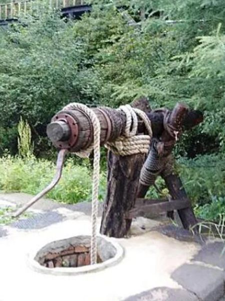 辘轳或许堪称最简单的机械了。其构造是在井上搭一木架,架起横轴,轴上套一木制长筒,筒上绕以长绳,绳的一端挂水桶。长筒头上装有曲柄,摇动曲柄,绳即在筒上缠绕或者松开,水桶亦因之而吊上或放下,用以取水。辘轳的起源很早,据《物源》上说,是“史佚始作辘轳”。史佚是公元前1100年左右周初的史官。