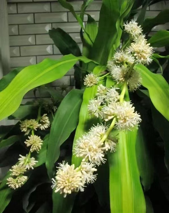 记得2006年一个初夏的傍晚,我和爱人回到家中,一缕幽幽的香气飘然而至,不禁有些惊奇,这气味是从哪里来的?难不成是谁碰倒了香水瓶?循着气味我们从房间找到阳台,看到一株巴西木不同往常。细细端详,只见从巴西木的叶顶部向下伸展出较粗壮的绿茎,绿茎两旁错落结出一团团乳白色的花穗,每只花穗由几十个簇集的细长的花蕾组成。每株细嫩的花蕾,顶端呈黄绿色。花蕾闭合,排列有序,清素淡雅,含苞欲放。而绽开的花蕾有6个瓣,开着雪白色的小花。两侧有着淡紫色的条纹,中间那长长的淡黄色的花蕊,争先恐后探出花瓣,像一张张撑开的伞,相互交织,形成一个圆圆的花球,形态很像蒲公英,又比蒲公英的轻盈纤细更显厚重、更显力度。展示着无限的娇媚,溢出诱人的香气。难道观叶植物巴西木也会开花? 带着好奇和突如其来的欣喜,我到网上去问问度娘,了解一下巴西木的生长知识。经求证,这就是巴西木开花了。