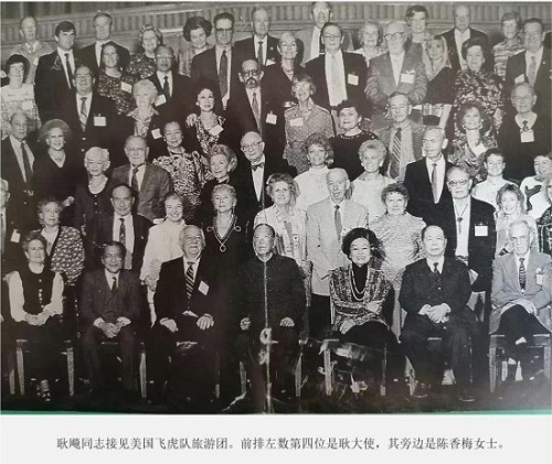 5、耿飚同志接见美国飞虎队旅游团。前排左数第四位是耿大使,其旁边是陈香梅女士。