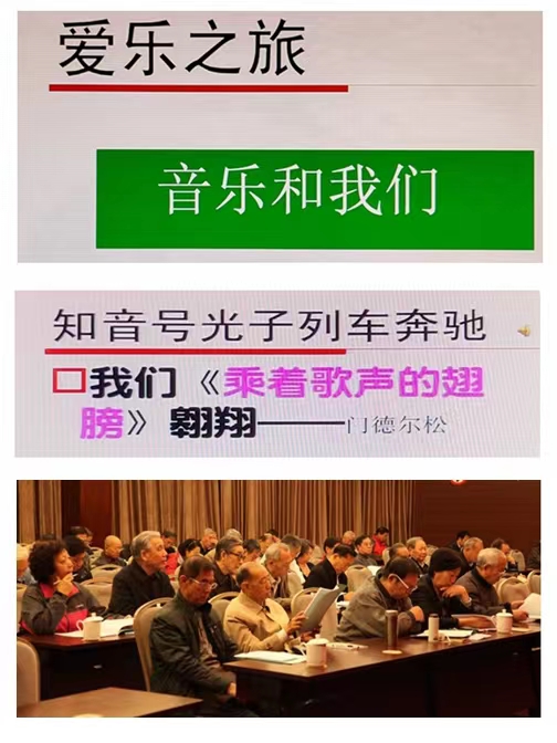 有人说这么多有身份的老领导,甚至有音乐高校的领导,为什么不讲交响乐?起初我也这么想,好像不讲西洋的交响曲就不能体现高大上。后来我放弃了,根本原因就是务实。正确的选择,源于正确的判断。就他们的职务讲,都是曾经指挥千军万马的人,但这不代表在音乐领域的认知力,不可否认,这其中不乏音乐素质高的人,但就大多数人而言,在过去紧张的工作中是没有机会了解音乐艺术中的专门知识的,而这些知识却是欣赏西洋交响乐必须的门槛。比如讲贝多芬的《命运》,就涉及到什么是西方古典音乐?西方管弦乐队的构成和各种乐器的音响特征,贝多芬的生平和音乐风格,交响曲的曲式结构等等,没有这些基知识铺垫,就是难为听赏着,哪怕只讲一个乐章,一上午的时间也不够。我不管准备得多精细,讲得多卖力也不一定收到好的效果。所以我必须从听者的需要出发,把目标定位在普及,普及音乐知识、了解音乐的功能、懂得音乐欣赏的作用、体验音乐的美感和精神快感,从而懂得人们的生活里不能没有音乐,它是我们精神家园里不可缺少的营养。我希望的是老同志能主动地把音乐当作自己的知心朋友,有运用音乐艺术的营养提高晚年精神生活质量的意识,这才是“音乐和我们”的目标定位。
