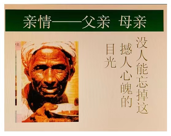 “你入学的新书包有人给你拿,你雨中的花折伞有人给你打,你爱吃的三鲜馅有人给你包,你委屈的泪水有人给你擦。这个人就是娘,这个人就是妈,这个人给了我生命,给我一个家,不管你走多远,不管你在干啥,到什么时候也离不开咱的妈……”