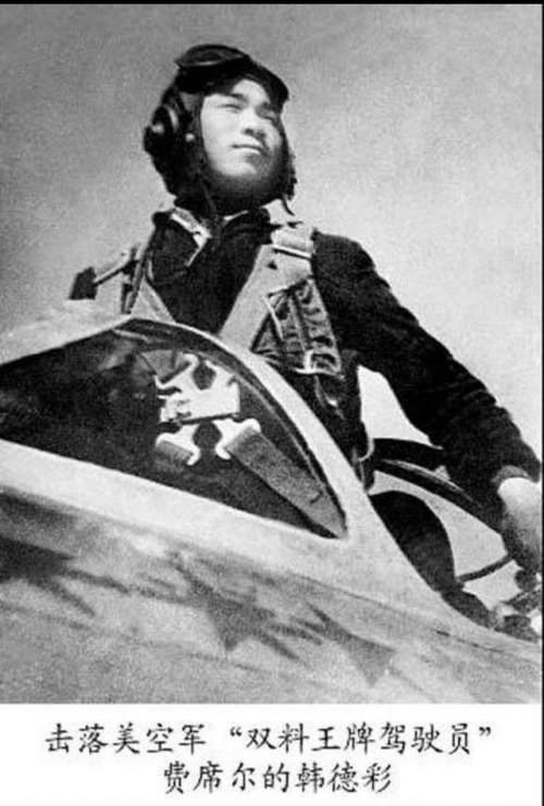 韩德彩抗美援朝战争中两次赴前线轮战,共击落美机5架,击伤1架,荣立2次一等功,被授予二级战斗英雄荣誉称号