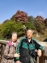在百花坪的观景台上,我用摄像镜头拍下了其周围花山鲜花烂漫的景致。我们走进山中的小径,一下子就被花树包围了。我观察着周围美丽的花朵,寻找自己中意的摄影目标。穿过这片树林,出现一块四周被花山环绕的空地,对面山顶上的万花楼清晰地呈现在眼前。我用视频记录下了四周的花山,凸显出鲜花满山的壮丽景象。