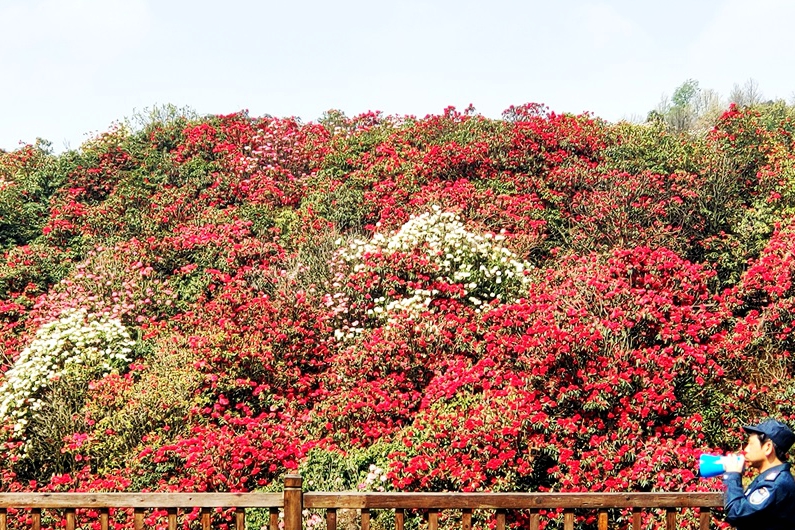 我们从百花坪站乘观光车前往马缨林景点,沿途路边茂密的花树不断从眼前闪过,当杜鹃花的颜色大部分成为红色时,马缨林景点到了。