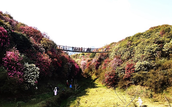 百里杜鹃分成数个景区,我们重点参观了金坡景区。金坡景区是百里杜鹃的精华所在,其中有百花坪、万花楼、索玛吊桥、马樱林等主要景点。