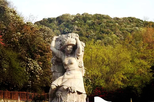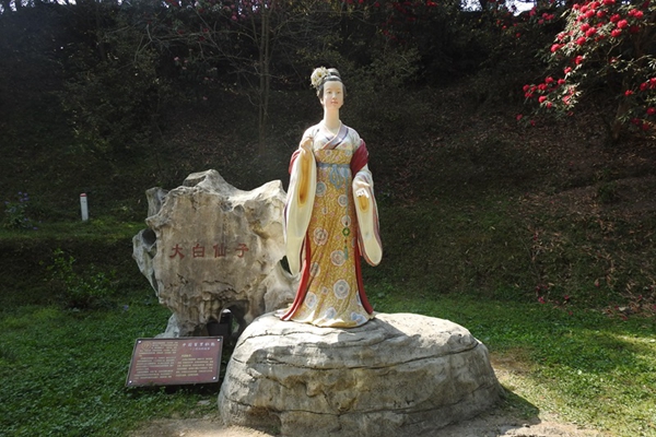 穿越索玛吊桥后,我们下行到了山脚下的观光车通道上。一路上,依然是被繁茂的鲜花所包围。我们一边向景区观光车站方向行走,一边拍照。忽然,我看到山脚下出现一座古代美女的塑像。从其一侧的标牌上,我知道了这位美女是大白仙子。从文字介绍中我又得知,大白仙子来自于《十二花仙的故事》。故事说,开天辟地的盘古生有二男一女,其长子负责管理天庭,就是玉皇大帝;次子管理人间,就是黄帝;他的女儿负责管理百花,被人们称为花神。花神派出十二名花仙,司职各种杜鹃花的生息繁衍,凋繁时令。十二花仙中的大白仙子清新爽朗,典雅大方,身材高挑有型,性格爱憎分明,处事风格简单直接,受到花神的喜爱。她代表的花是大白杜鹃,花色洁白清雅,花簇繁茂漂亮。