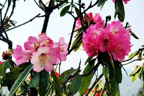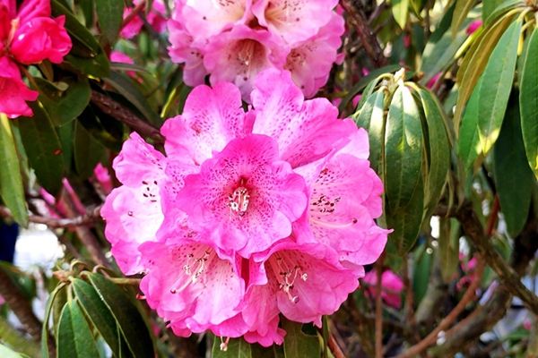 毕节的杜鹃花多而繁盛艳丽,大多数杜鹃花成簇开放,一簇杜鹃花中有多个花朵,用“花团锦簇”来形容杜鹃花可谓恰如其分。
