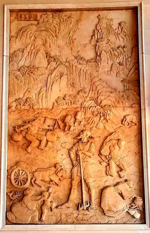 从生产区的二道门出来,与刘主任回办公楼的时候,来接大伙下班的班车刚刚开进了公司大门。在一楼的门厅里,我驻足在东侧那幅高大的愚公移山浮雕前,抬头仰望。雕塑里,只见巍峨的山峦起伏之下,有这样一群人,他们或肩背,或担挑,或车拉,还有老妪事炊,孩童参与,均无所愄惧,都欣然运石在山海之间往返。而愚公则手执镢头居中站立,神情坚定自若,双目如炬望着远方。而西墙的浮雕则是另一幅广为传颂的神话故事,精卫填海。