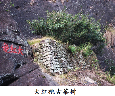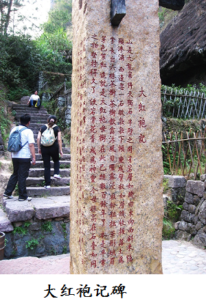 在九龙窠最后一窠的高岩峭壁间,有一片用石块垒成的盆景式茶园,上面生长着几株茶树,那就是久负盛名的大红袍古茶树。岩壁上有1927年天心永乐禅寺和尚所作的“大红袍”石刻。在岩壁下建有一个小平台,上面竖立着一块[w1]方柱形石碑,刻着《大红袍记》。现将《大红袍记》全文逐字抄录如下(原文为繁体字,无标点,我改为简体字,并试着加了标点。)
